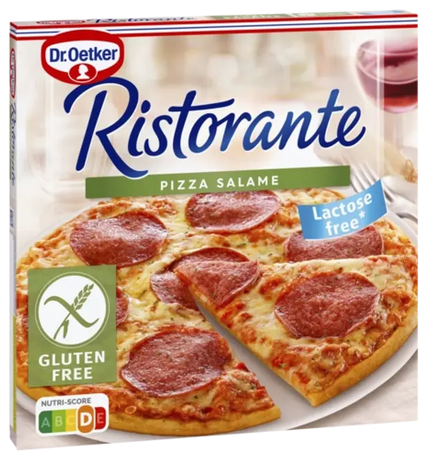 Dr. Oetker Ristorante Salame pizza, glutenfri och laktosfri. Botten är tunn och spröd, och pizzan är toppad med aromatisk tomatsås, ost och saftig salami.
