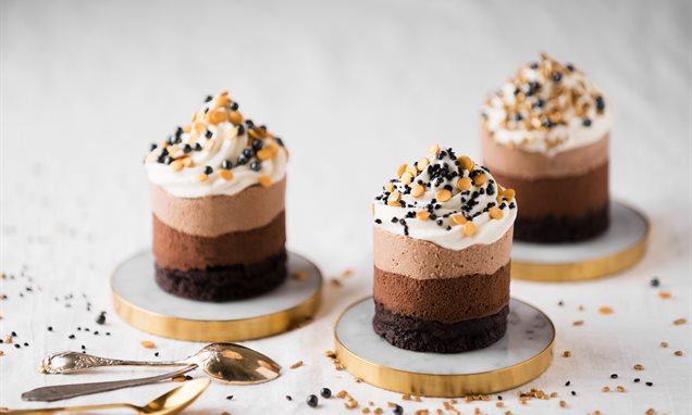 Tillred mjölkchokladmoussen på samma sätt som den mörka chokladmoussen och häll den över det första chokladlagret i bakplåtskragen. Låt stelna i kylskåp i minst 4 timmar eller över natten.