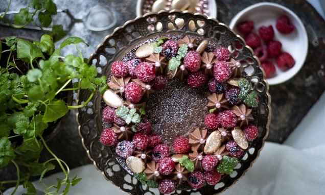 Dekorera den med resterande chokladmousse och färska hallon fyllda med choko kristyr, Rose &