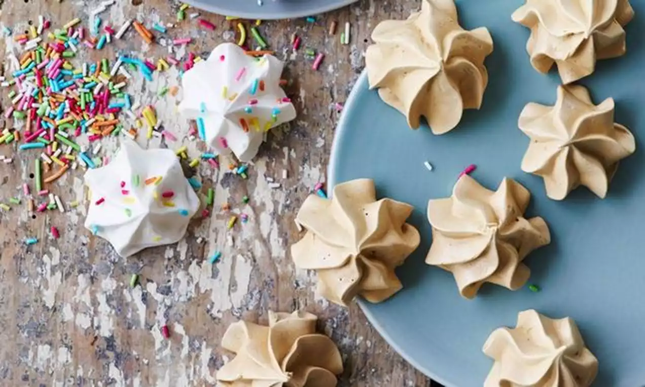 Lägg ett bakplåtspapper på en plåt. Häll marängen i en spritspåse med stjärntyll och spritsa ut små maränger på plåten.