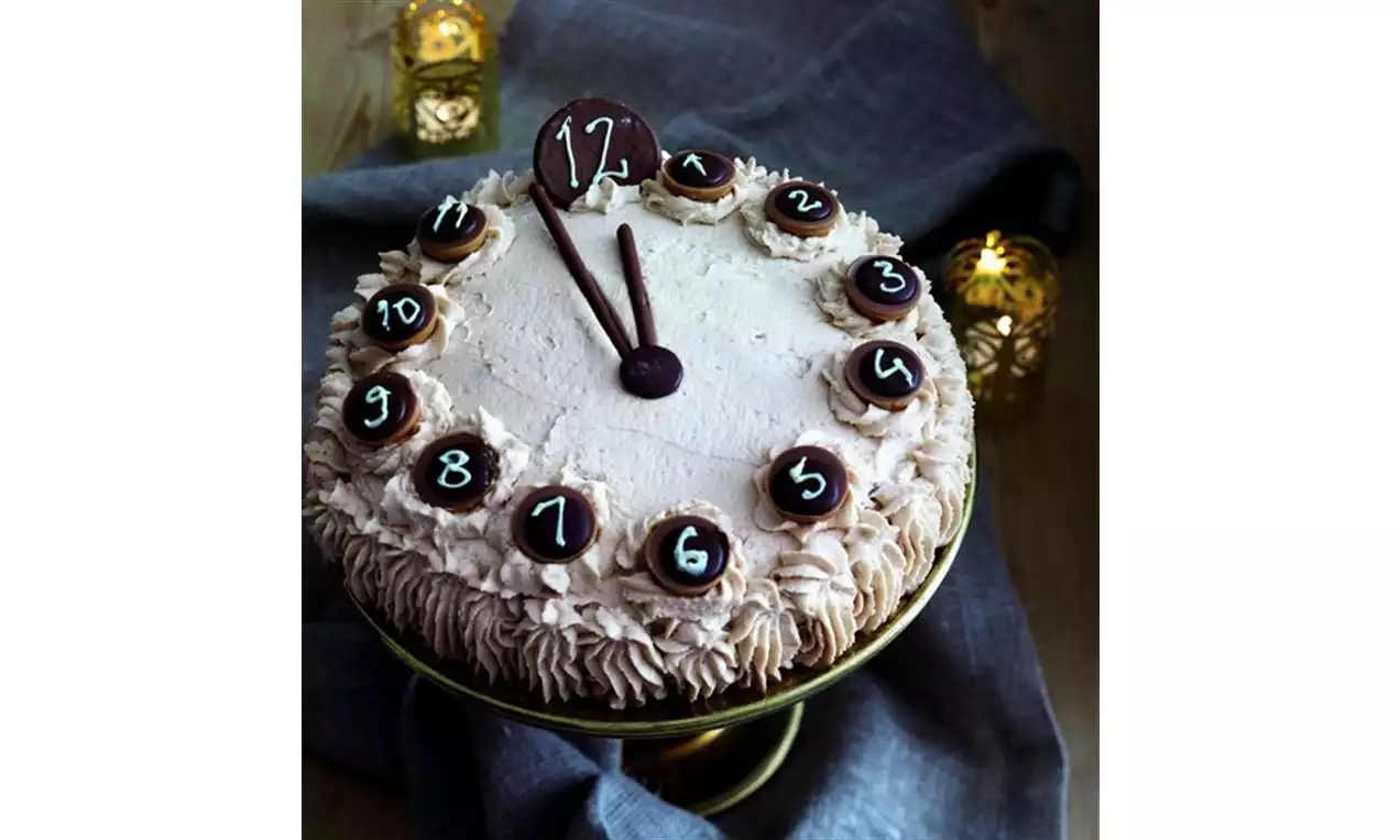 Dela kakan i två bottnar. Mosa bananerna. Blanda i citronaromen. Bred moset på den ena bottnen. Vispa grädden fast med gelé- och vaniljsockret. Rör i den rivna nougaten. Bred 1/3 av gräddblandningen på bananfyllningen. Lägg på den andra kakbottnen. Bred resterande fyllning runt hela kakan. Spritsa ut siffror från 1 till 12 på Toffifeebitarna och Noblesseplattan med dekorationsglasyren. Vispa grädden fast med florsocker. Spritsa grädden på tårtan, garnera med de numrerade Toffifeebitarna och Noblesseplattan. Gör visare av chokladpinnarna och chokladlinsen.